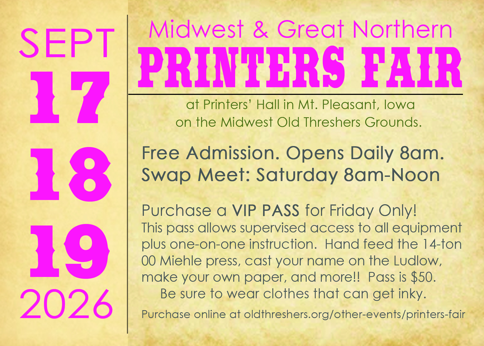 Printers' Hall demonstrations will be happening all day Friday. Purchase a $50 VIP PASS and receive special perks and supervised full access.  Hand feed the 14-ton 00 Miehle press (great photo-op), cast your name on the Ludlow, make your own paper, run the thermography machine, and so much more!!  Purchase your VIP PASS before Monday, September 14th; it will be waiting for you when you arrive at the Fair.