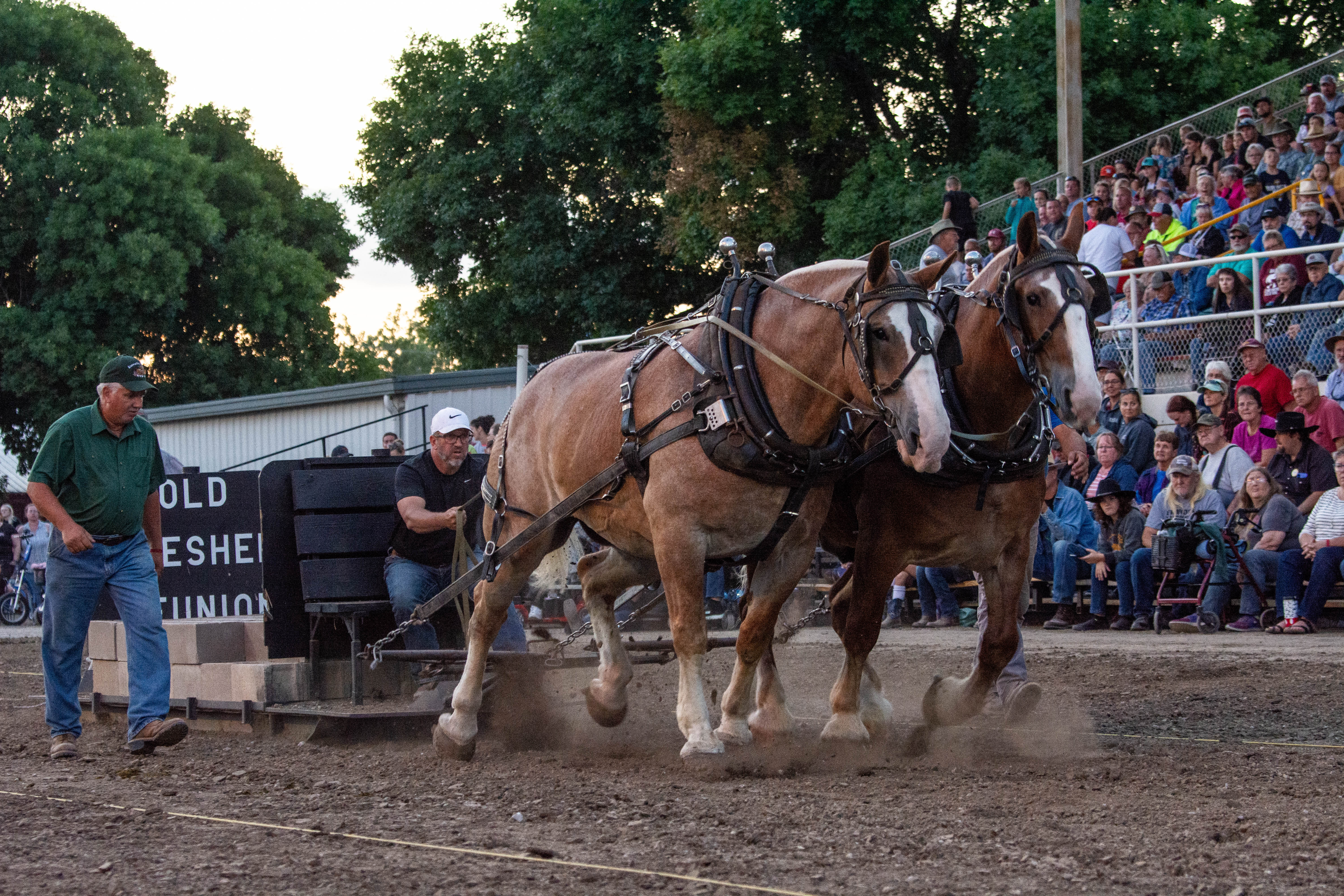 Each day at noon, visitors to the Old Threshers Reunion gather in the Grandstand to watch the Cavalcade of Power.